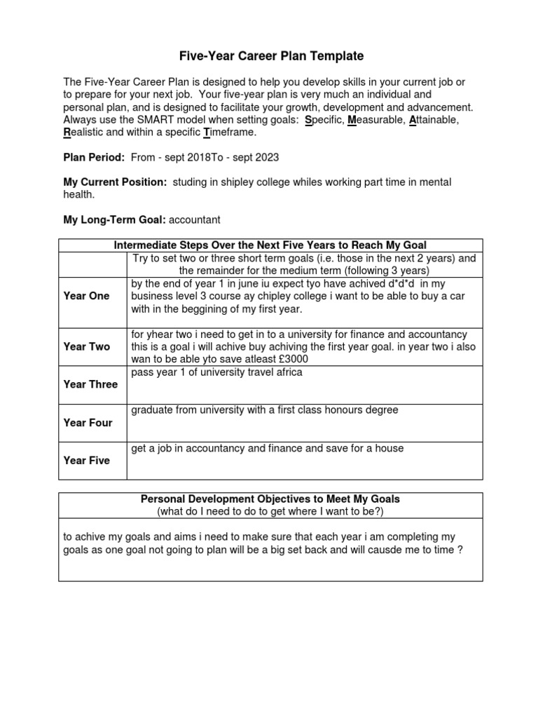 Five Year Career Development Plan Research Paper from studentshare.info It may be that you have to practice this exercise on a number of occasions as your ideas may not flow the first time you do it. Our main objective is that these 5 year career plan template pictures gallery can be a guidance for you, deliver you more samples and most important: It was created for reporting and communication purposes such as the template was also created with the timeline generator from office timeline which can automatically update the template with your plan's data in.